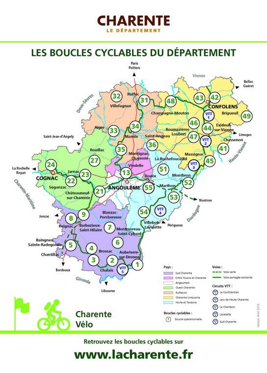 In wezen gebaseerd op gedeelde rijstroken en groene rijstroken, vertegenwoordigt het nu bijna 450 km gemarkeerde routes. Deze rondreis door de Charente stelt u in staat om: reis door de vier hoeken van de afdelinglangs pittoreske wegen.